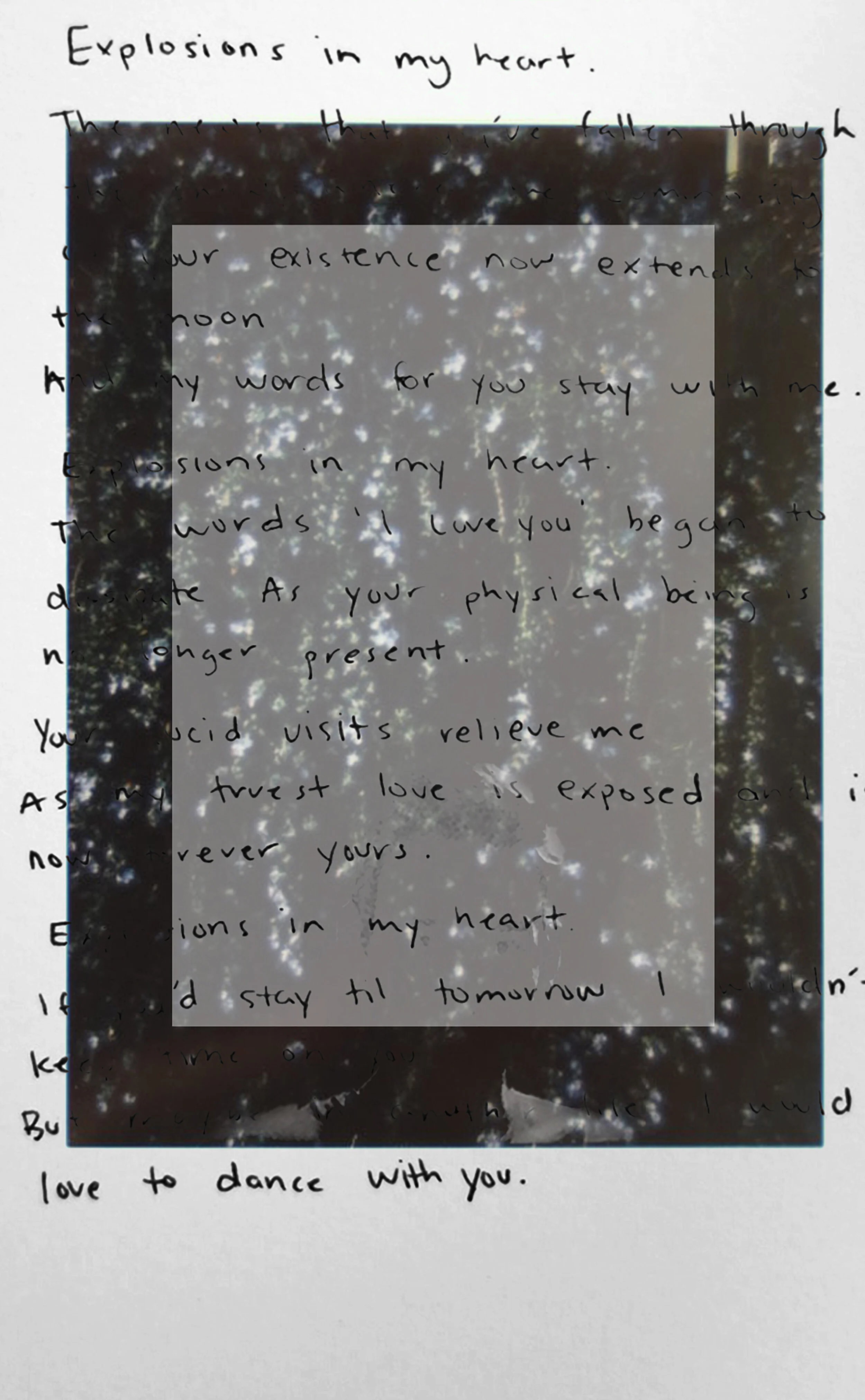 Color, motion, and nature- nothing is more familiar than this. Something we’re not all so familiar with is the sudden loss of someone. We’re not taught how to respond, react, and continue with our routines. The combination of organic motion, seasonal colors, and my honest words inspired me to grieve creatively. In doing so, I combined and mixed instant film with other photographic elements that figuratively illustrate my exploration of grief, existence and bring my words to life. The use of these photographic elements and words speaks to the blend of emotions of loving someone dear and them not knowing as their soul departs their body.